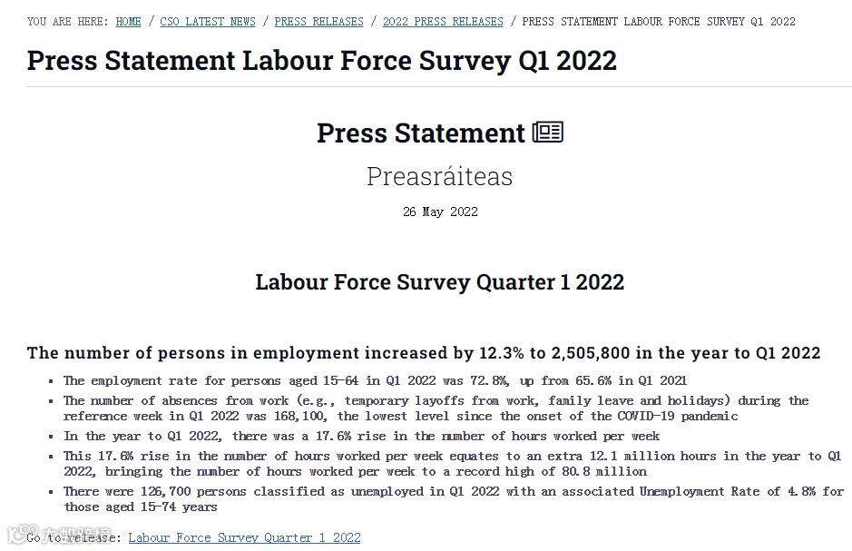 近期,爱尔兰中央统计局(CSO)发布了 2022 年第一季度劳动力调查(LFS)的结果。根据调查,目前爱尔兰就业人数已跃升至250多万,创下了历史纪录。在2022年第一季度有 126,700 人被归类为失业者,15-74 岁的相关失业率为 4.8%。