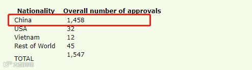 在已批准的申请中,获批的中国籍投资者共有1458人,占比高达94%,位居第一。