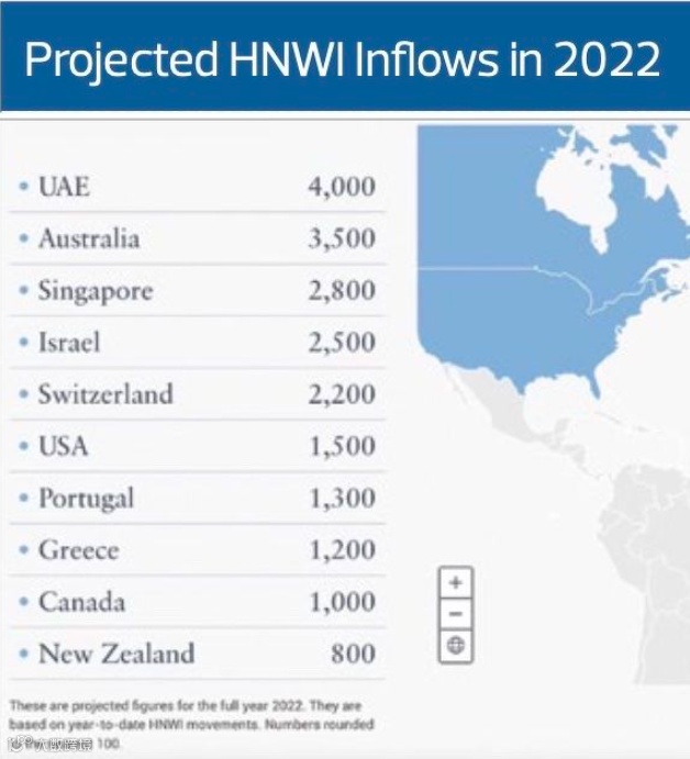 邻近的新西兰也因为安全和稳定预计将在2022年获得800名高净值人士的净流入。