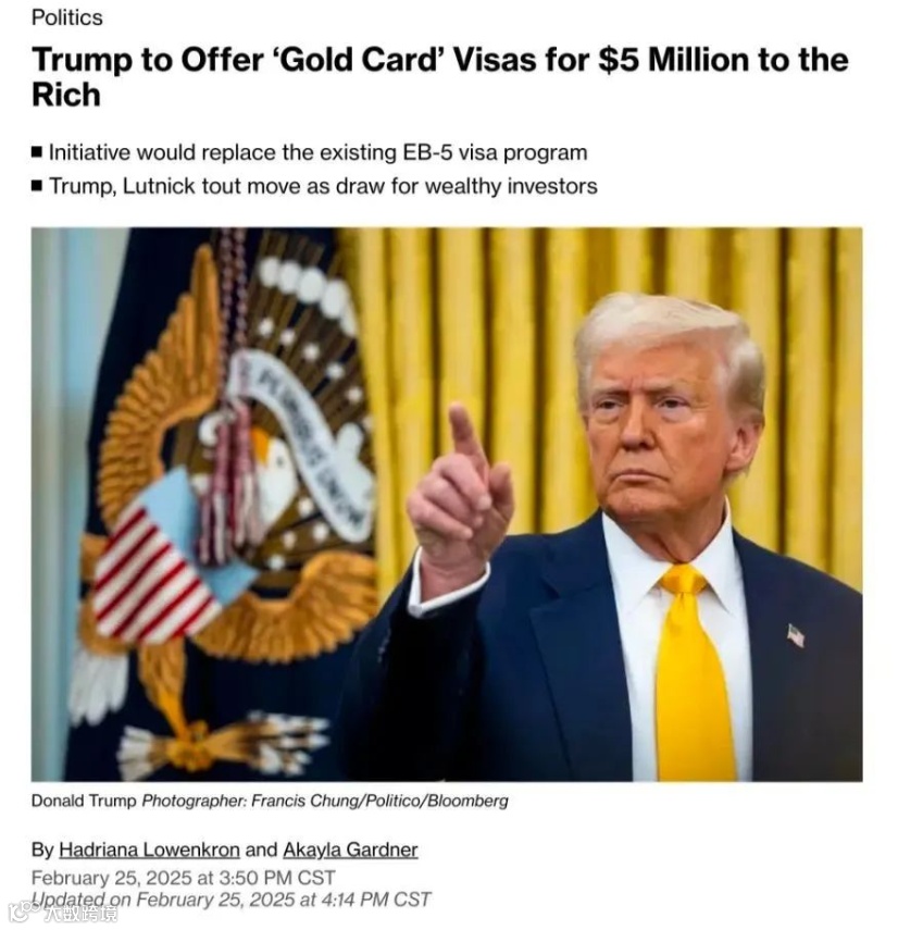 当地时间2月25日下午,在白宫椭圆形办公室举行的新闻发布会上,川普总统预告了他将推出新的签证项目——标价为500万美元的“川普金卡”(Trump Gold Card),预计两周内即将推出。