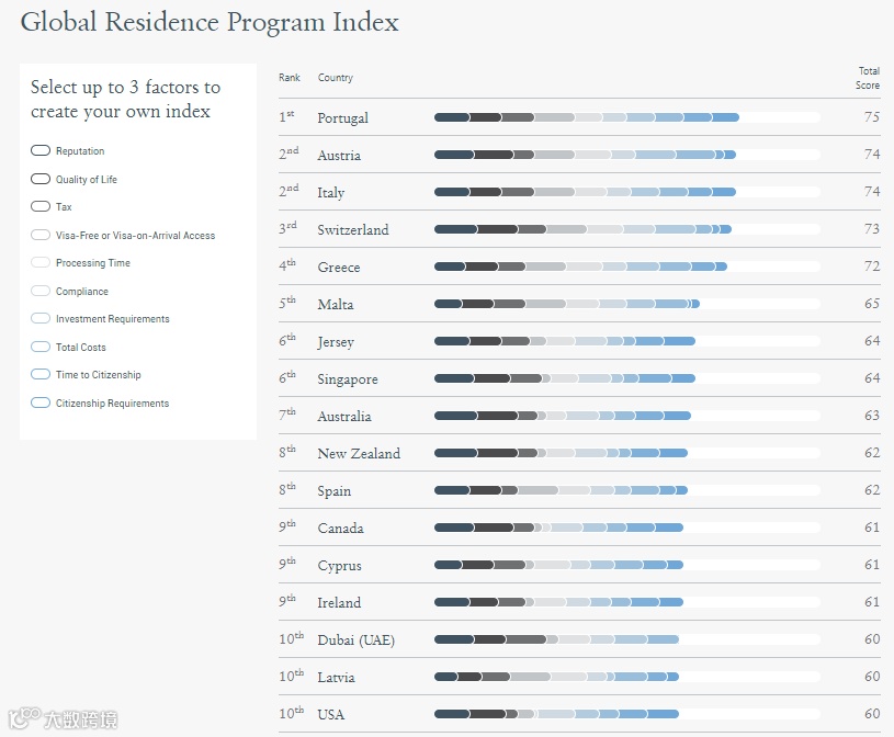 葡萄牙黄金居留项目以总分75分超越全球其他居留计划,再次荣登榜首。去年的排名中,葡萄牙与奥地利并列第一。