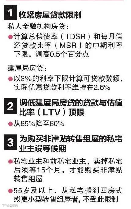 1.将私人金融机构借出房屋贷款时用于计算总偿债率(TDSR)和每月偿还贷款比率(MSR)的中期利率,从3.5%调高0.5个百分点至4%。非住宅房地产贷款的中期利率则从4.5%调高到5%。