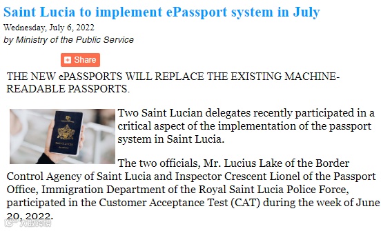 据圣卢西亚官网报道,圣卢西亚将于7月实施电子护照系统。