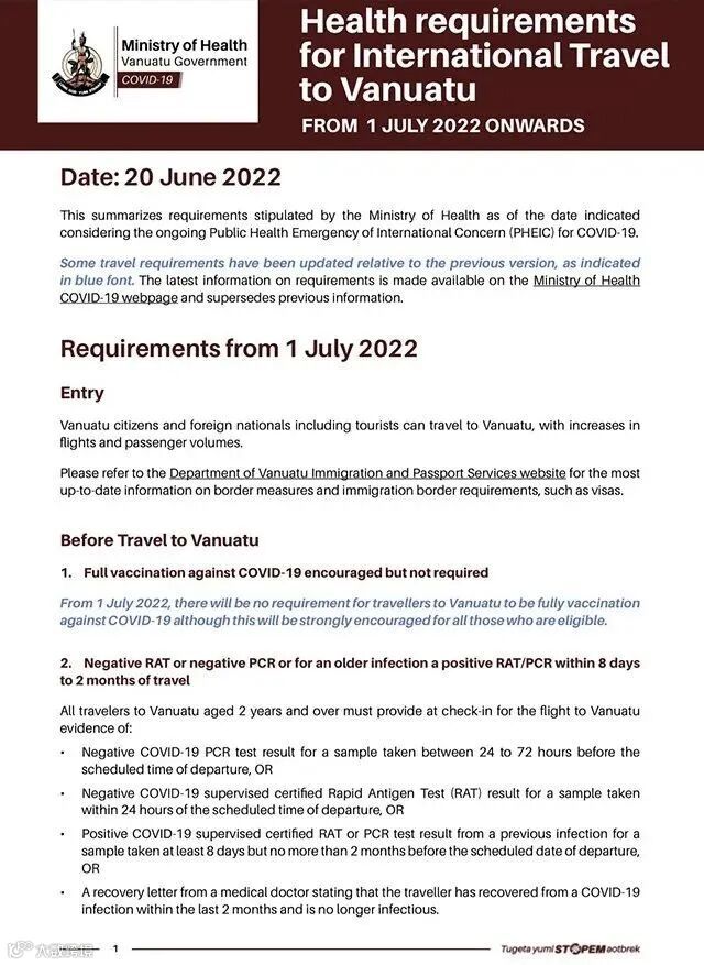 据当地媒体报道,瓦努阿图已于7月1日重新开放边界。国际游客可以通过空运和海运前往该国,游轮现在可以不受限制地进入瓦努阿图水域。瓦努阿图鼓励但不再强制要求访客完全接种疫苗,访客抵达后若无新冠症状,则无需隔离及核酸检测。