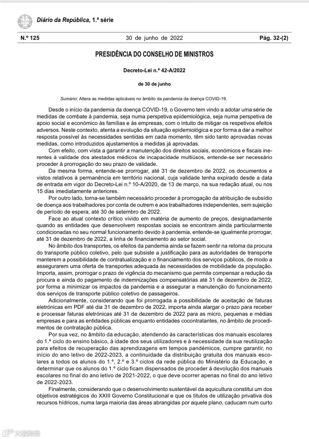 好消息!葡萄牙居留卡将再次延长有效期至今年年底。相关新法令(第 42-A/2022 号法令)已于6月30日在共和国日报上公布。