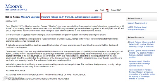 穆迪(Moody 's)在一份声明中表示:“爱尔兰的经济恢复能力在最近得到了改善,这可以从其对疫情的处理上得到证明,并且它很好地应对了俄乌战争带来的经济影响。