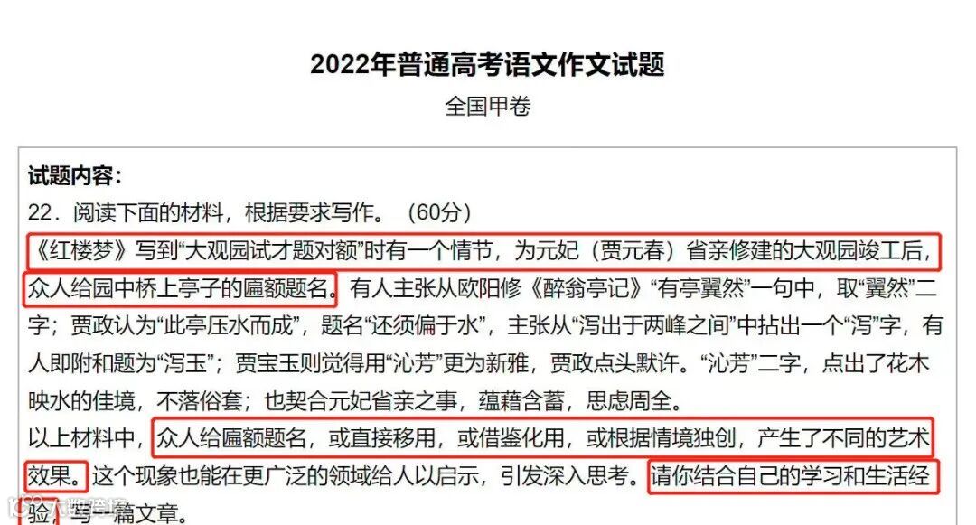 2022年高考落下帷幕。而关于高考作文的讨论却热度不减。其中全国甲卷的作文题文化底蕴十足,以《红楼梦》中“大观园试才题对额”为题目背景,要求考生依据材料,并结合自己的学习和生活经验进行写作。