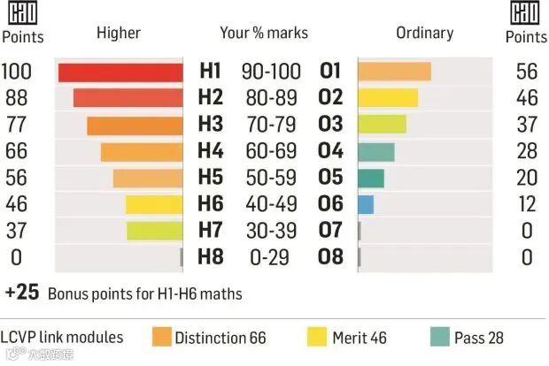 中文高考的毕业成绩无论普通级(Ordinary Level)和高级(Higher Level)都将采用八分打分制。最高打分为H1(选择高级中文课程的最高分)或O1(选择普通级中文课程),该打分制意味着学生在高考中文中取得90% - 100%的成绩即可获得该打分。打分获得H1或O1的学生,在计算高考成绩时按照高考中文拿了100分来计算。