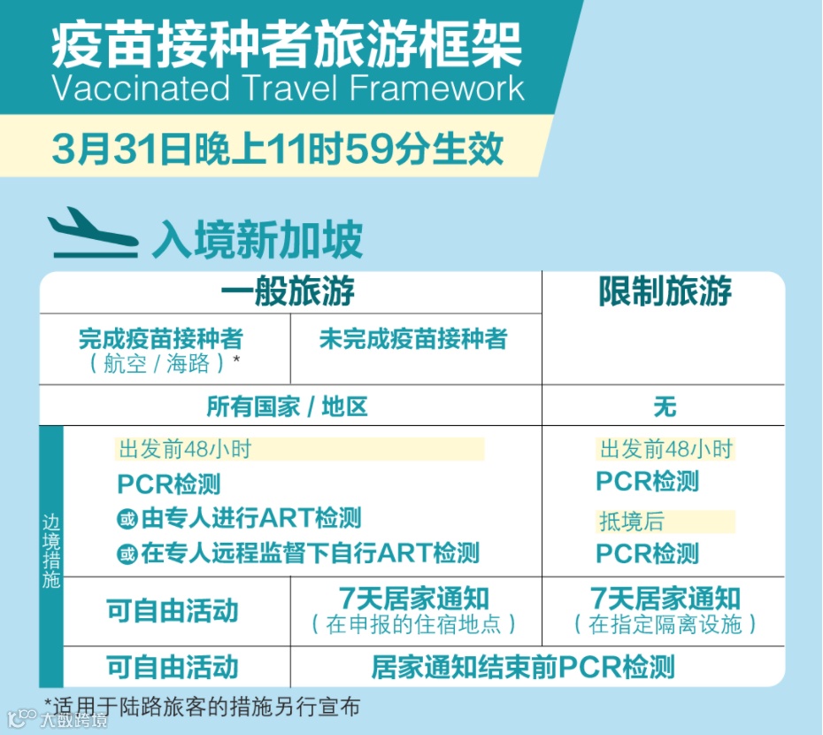 自2022年4月1日起,新加坡跨部门抗疫工作小组宣布:取消所有现有的VTL和单边开放(UO)安排,来自任何国家或地区的完成疫苗接种者,只要在过去7天内未访问过卫生部限制类别的任何国家或地区,将可免检疫进入新加坡,目前没有任何国家或地区属于限制类别。