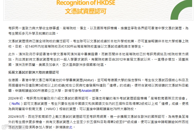 7月3日,香港考评局发文介绍DSE国际认可最新发展。继今年初获荷兰认可有五科「22222」的DSE考生可申请报读当地78所大专院校后,西班牙教育部于近期确认,考生于5科2级(DSE 10分)或以上成绩,即可直接申请报读逾90间西班牙大学,无需参加额外入学考试。