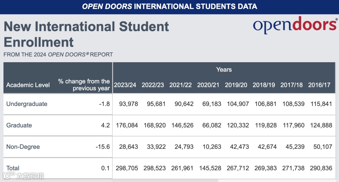 在2023-2024学年,国际新生总人数略有上升,达到298,705人,涨幅为0.1%。