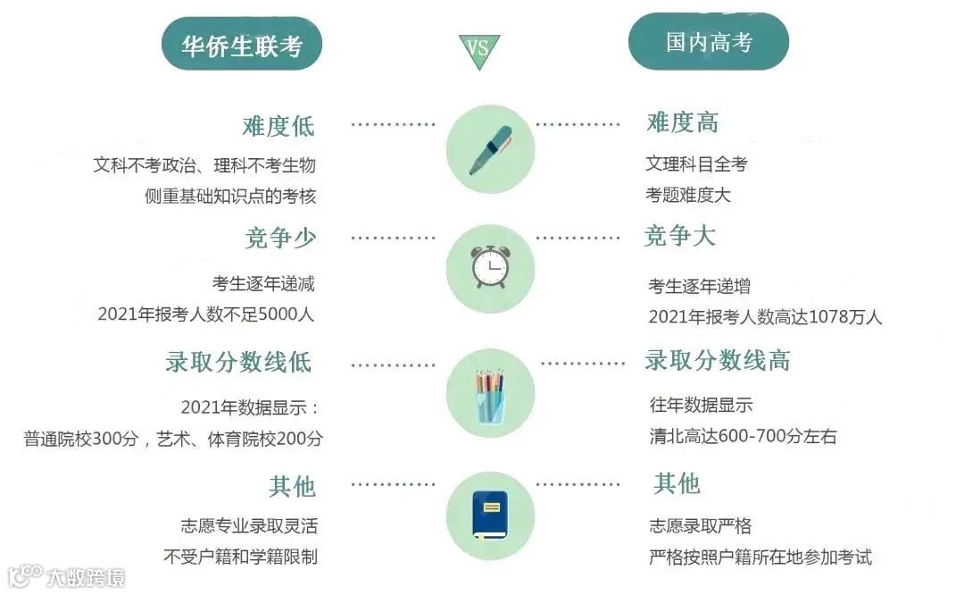 华侨生联考具有政策宽松、录取分数低、考试难度低等优势,每年清华北大等名校录取线保持在400分!
