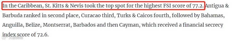 TJN最新公布的「金融保密指数」,在加勒比地区,圣基茨和尼维斯以77.2的最高FSI得分位居榜首。