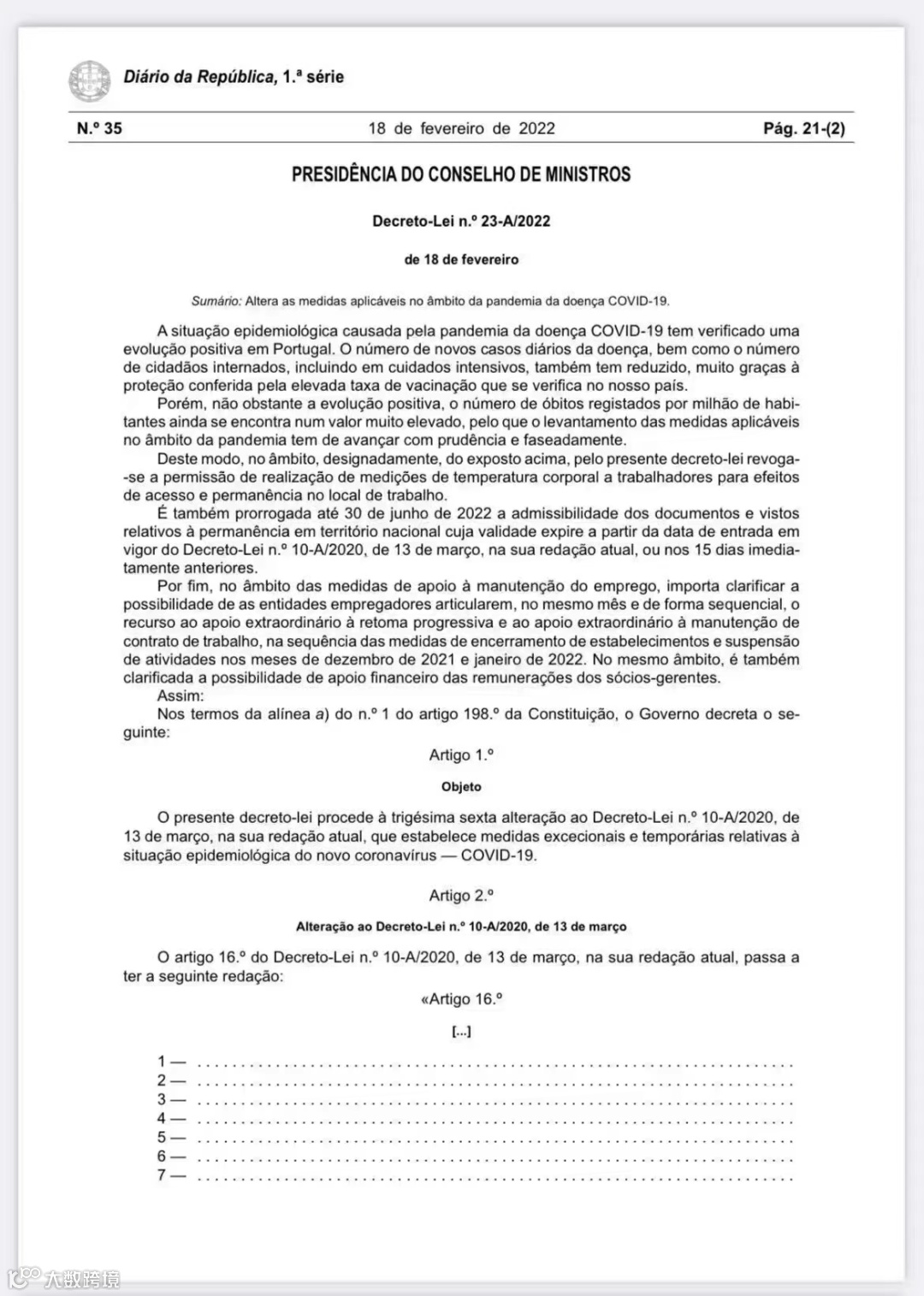 据葡萄牙部长理事会决议,于2022年2月18日登报生效Decreto-Lei n.º 23-A/2022 法律,其中明确了在2020年2月24日之后过期的居留卡,其有效期可自动延期至2022年6月30日。