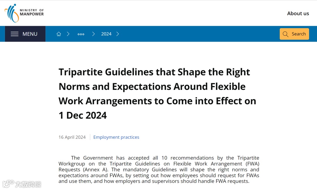 4月16日,新加坡政府人力部宣布,从12月1日起,所有在该国运营的公司需制定和维护正式流程,供雇员申请灵活工作安排,包括实现一周只工作4天、灵活的工作地点。雇主需在两个月内对员工的请求进行回应,并且必须为拒绝申请提供明确的书面理由。若雇主未遵守规定、无正当理由拒绝,将可能面临包括受到人力部警告等在内的处罚措施。