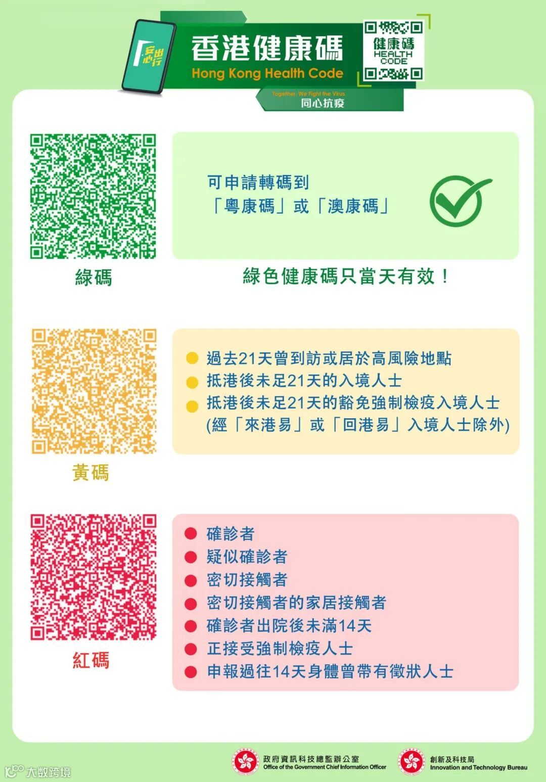 1.红码为确诊者、疑似确诊者、密切接触者、密切接触者的家居接触者、确诊康复但出院未满14天的人士、正接受强制检疫人士,以及申报过去14天曾带有病徵的人士。