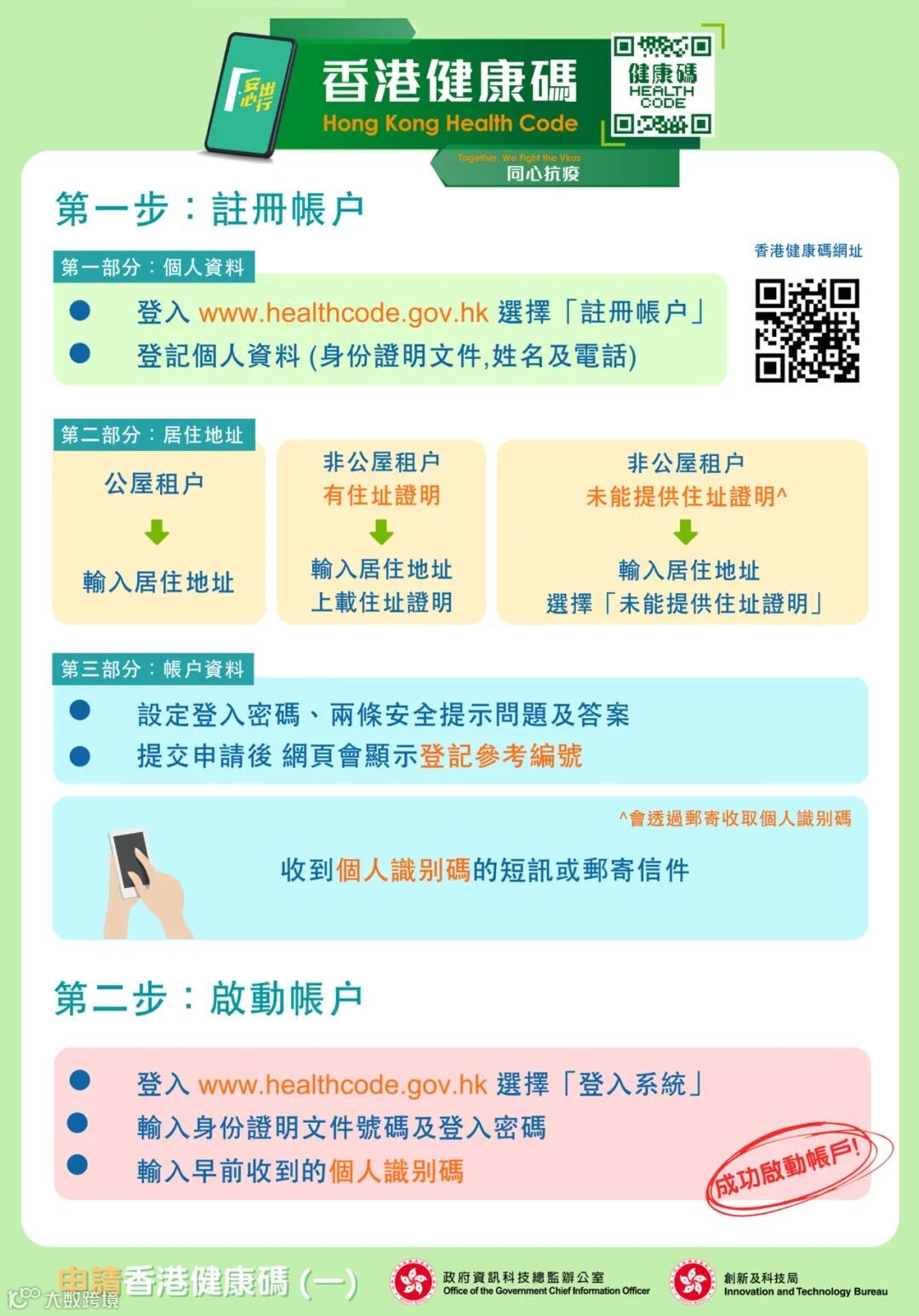 若申请人未能提供在港住址证明或系统未能核实住址,则需等候由政府发出包含个人识别码的确认信件,以启动帐户。申请人如非香港身份证持有人,则需携同信件及身份证明文件到指定邮局核实身份及住址。核实后,系统会以短讯向申请人发出个人识别码以启动帐户。