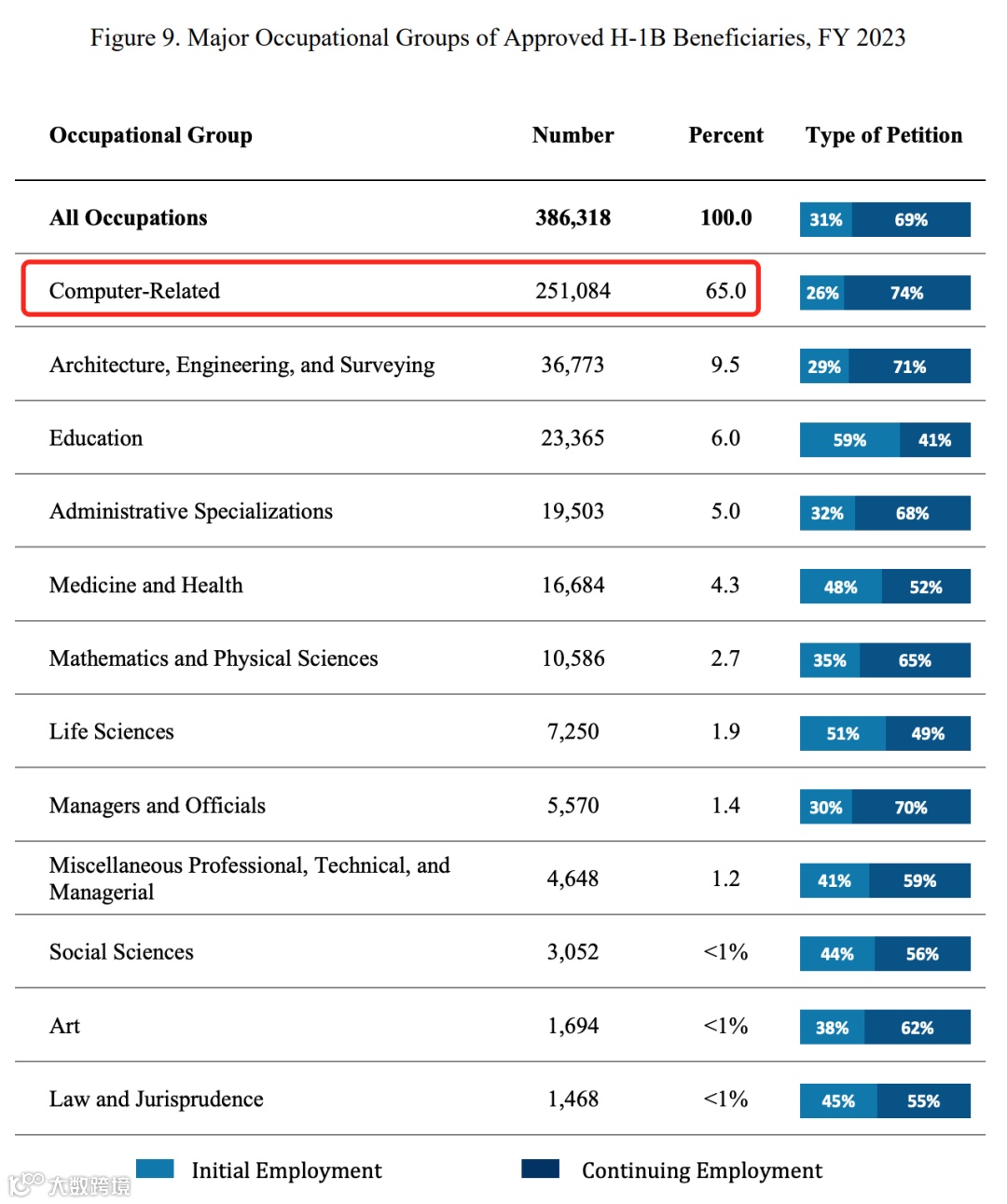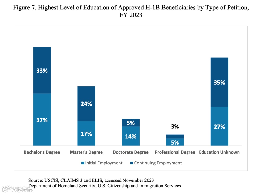 根据24年3月美国移民局发布的2023财年H-1B签证持有者画像来看,初次申请获批者中本科、硕士和博士的比例分别为37%、17%和14%;续签获批者中本科、硕士、博士的比例分别为33%、24%和5%。