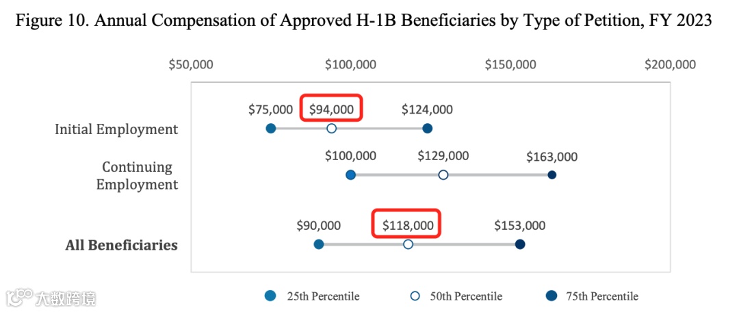 在薪资方面,2023财年所有H-1B获批者的年薪中位数保持在$118,000,初次就业的H-1B获批者的年薪中位数是$94,000。