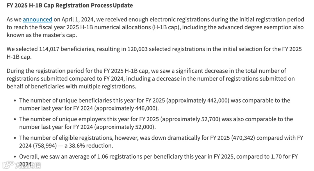 当地时间4月30日,美国移民局公布了2024年第一轮H1B的抽签数据。其中,今年H1B的注册总数量为479,953,有效的抽签注册数量为470,342,中签率约为25%。