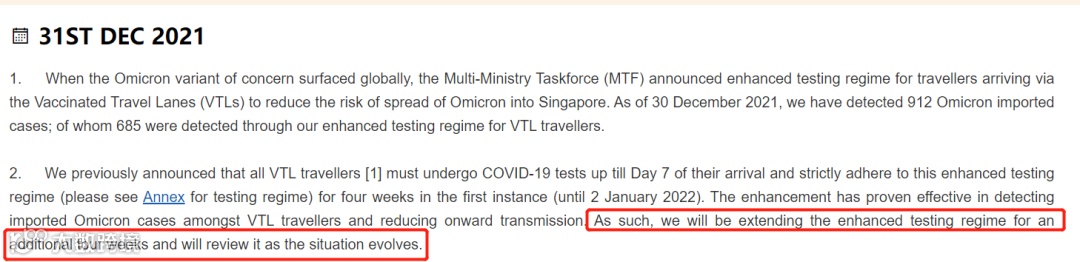 新加坡卫生部最近几天发布文告,称之前实行的强化版的疫苗接种者旅游通道(VTL)旅客检测程序,已证实能有效检测到输入型奥密克戎病例,因此当局决定继续延长执行四周。