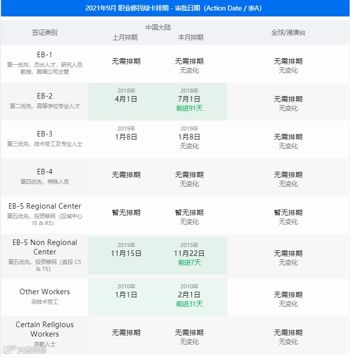 美国东部时间8月13日,美国国务院签证办公室公布了2021年9月(2021财年第12个月)的签证公告牌。其中:EB-1继续无排期,EB-5表A排期前进7天 , 区域中心计划因法案暂停暂无授权名额。