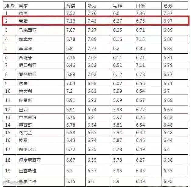 雅思(母语为非英语国家)A类考生成绩排名,希腊全球第二。