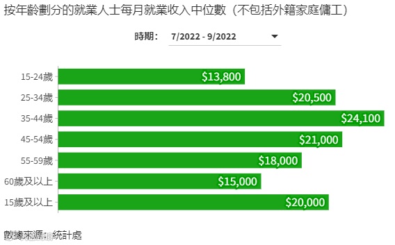 55-59岁就业人士收入中位数为20000港元,增加2000港元,增幅11.1%;