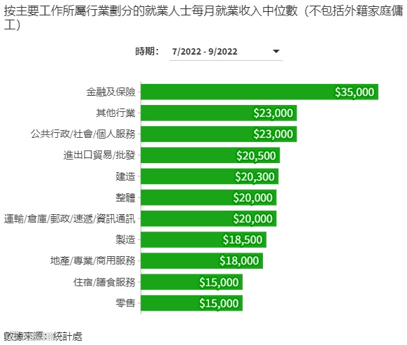 其次是公共行政/社会/个人服务业,收入中位数为25000港元;
