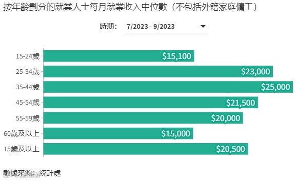 25-34岁就业人士收入中位数为23000港元,增加2500港元,增幅12.2%;