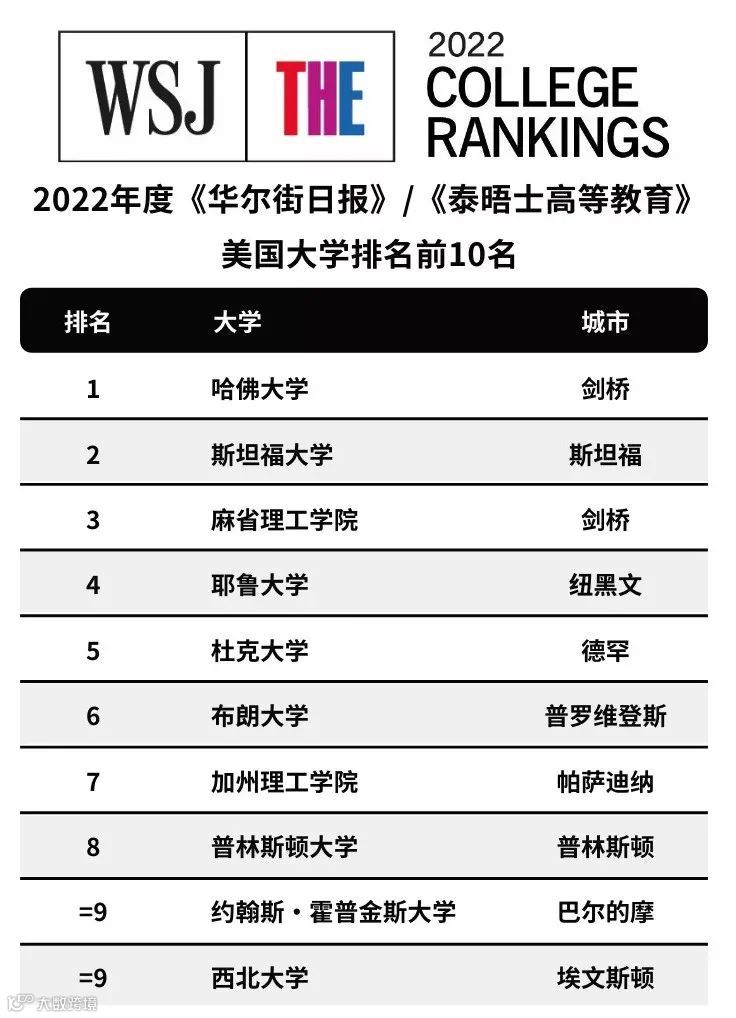 9月22日,泰晤士高等教育发布2022年度《华尔街日报》/《泰晤士高等教育》美国大学排名。本次排名共有来自近800所大学参与,哈佛大学连续6年位列榜首。斯坦福大学,位居第二,麻省理工学院排名第三。约翰斯·霍普金斯大学的排名从第11名上升至第9名,成为唯一一所首次进入前10名的大学。