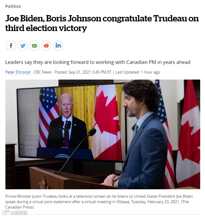 与此同时,美国总统乔·拜登、英国首相鲍里斯·约翰逊也在第一时间向加拿大总理特鲁多发来了恭喜他第三次获胜大选的祝贺。