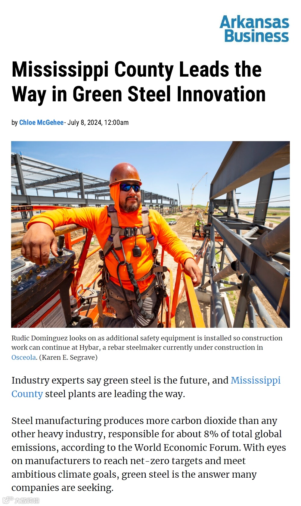 阿肯色商业Arkansas Business 7月为HYBAR海霸钢铁以及所在的阿肯色州密西西比郡做了专题报道《密西西比郡在绿色钢铁创新领域的领导地位》Mississippi County Leads the Way in Green Steel Innovation,文中提到:海霸除了使用电力作为生产能源,更将成为北美唯一一家使用直流电弧炉的螺纹钢生产商。海霸的创始人兼首席执行官Dave Stickler说:使用直流电意味着更大的经济投入、更具挑战的技术难度,但通过安装直流炉,每生产一吨钢所需的能源更少,这将进一步减少海霸钢铁生产过程中碳排放。