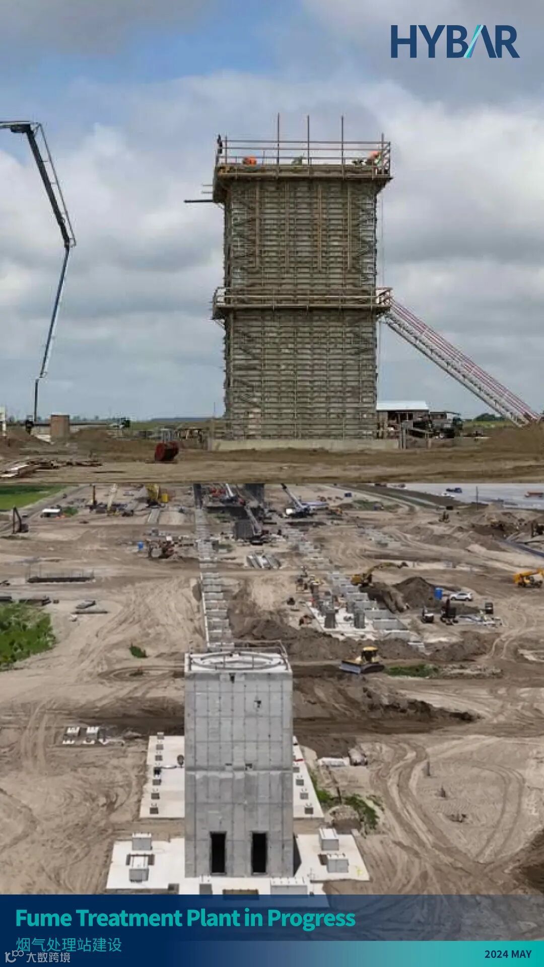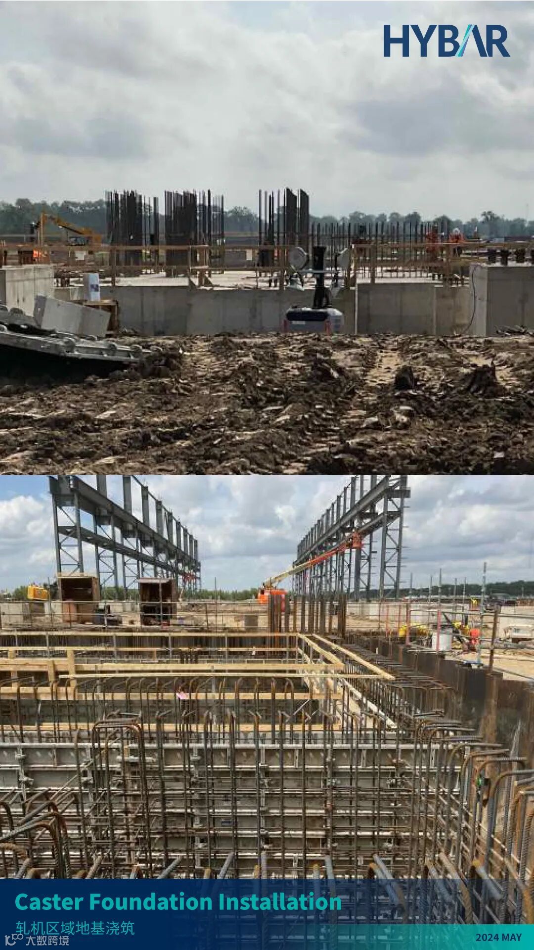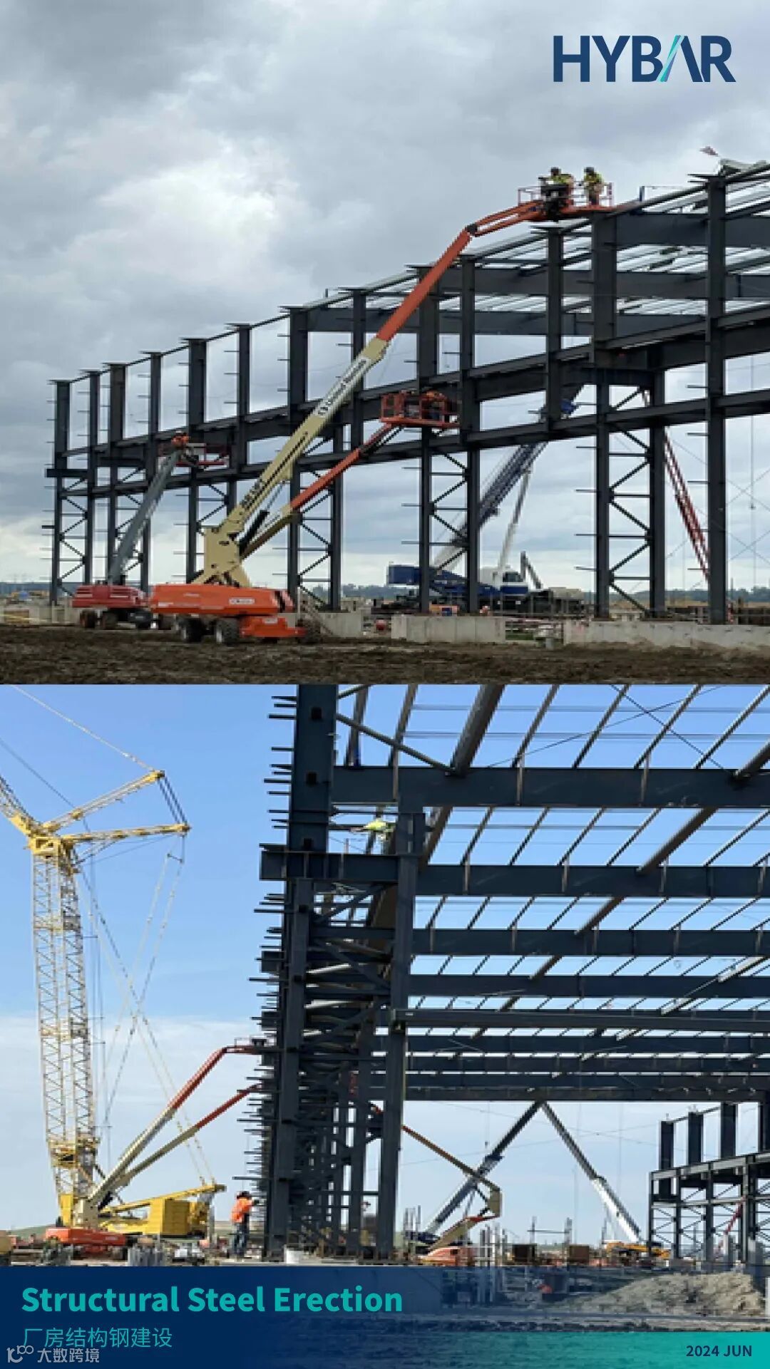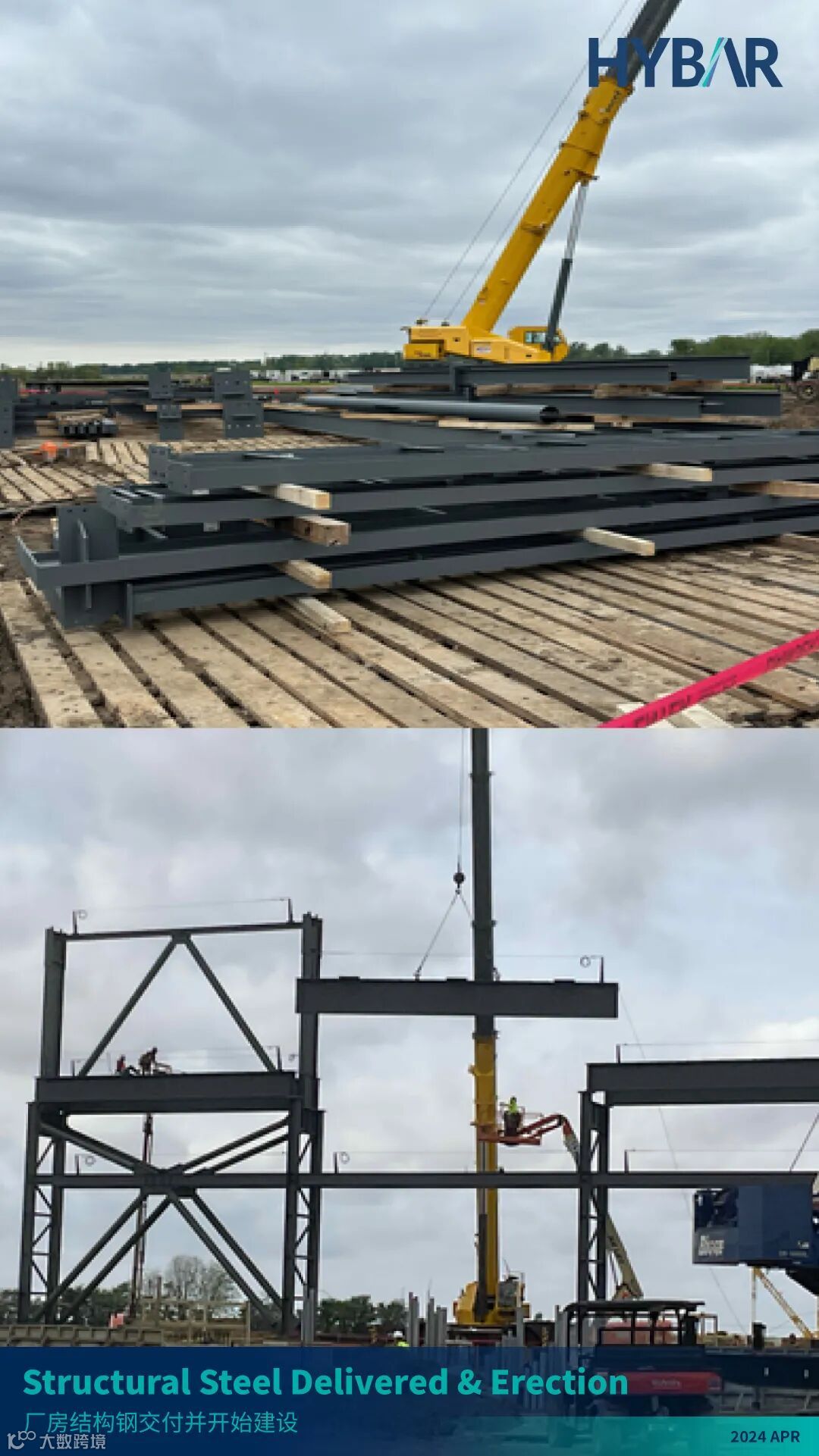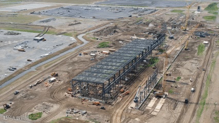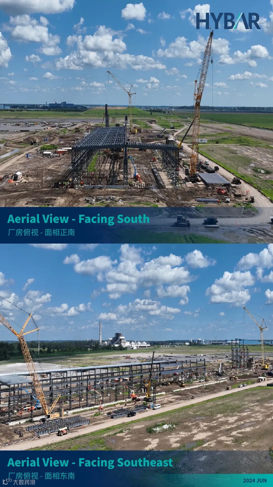 当2024的夏日热浪以不可阻挡之势席卷而来的时候,美国腹地阿肯色州奥西奥拉市的HYBAR海霸钢铁也正在以前所未有的速度拔地而起,一派热火朝天的工地盛况映入眼帘。海霸钢铁于2023年8月正式动工,当您读到本期松州为您带来的——松州3号:HYBAR海霸钢铁EB-5项目2024年第二季度建设进展更新(报告周期4-6月)的时候,建设已历时一年。从原本的蛮荒空地,到如今主体建筑钢结构拔地而起、厂区初见雏形,大家正有幸见证着一家全球技术领先、产品成本极具竞争力、最关键将绿色环保融入企业基因的一家传奇钢厂的诞生。