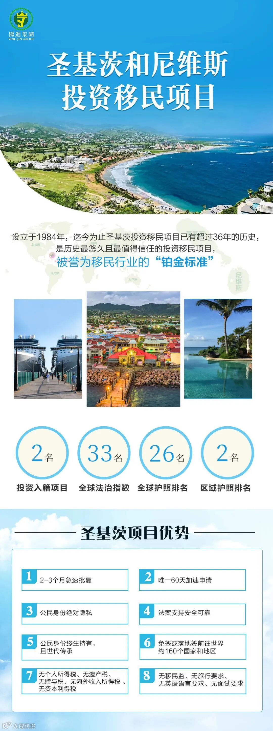 最新的H&P护照指数排名也显示,圣基茨以免签全球161个国家/地区,成为加勒比地区最有价值的护照,排名全球N0.24。