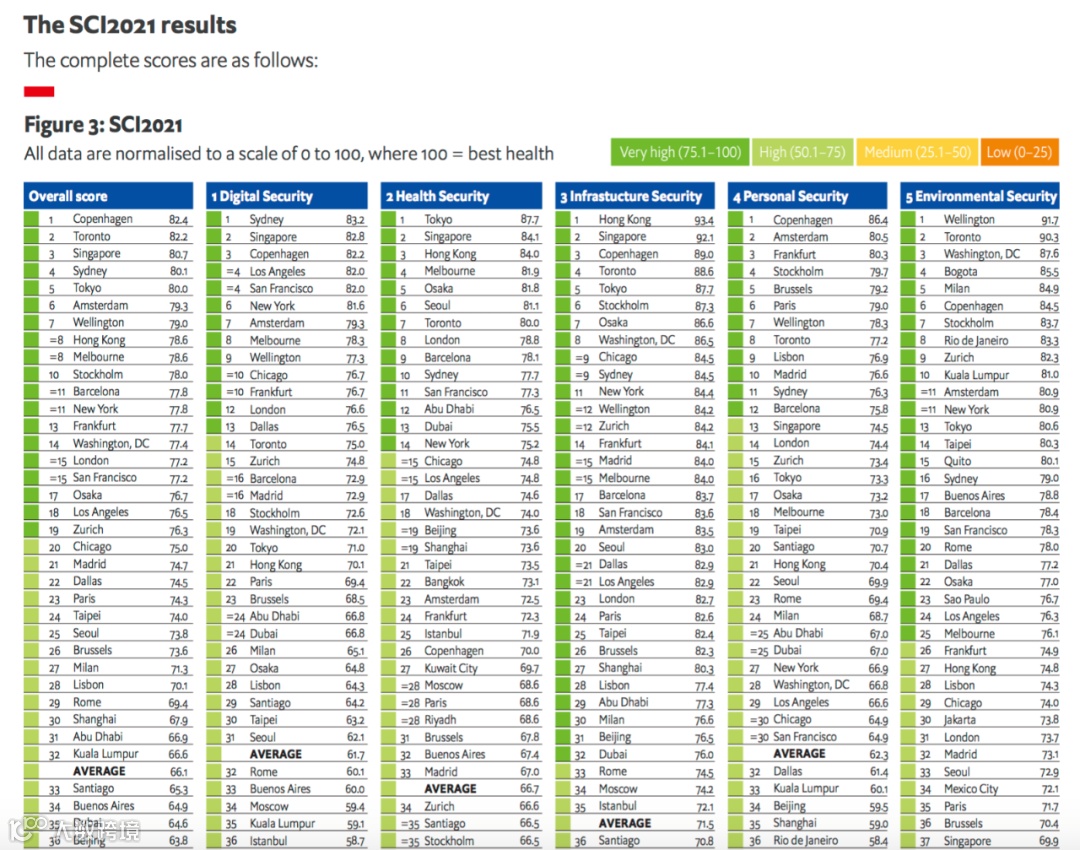 由《经济学人》(The Economist Group)周一(8月23日)发布的《2021年安全城市指数报告》(Safe Cities Index 2021)对全球五大洲的60座主要城市进行了调查评比,从数码安全、健康保障、基础设施安全、个人安全、环境安全等5大方面对这些城市的安全性进行了排名。