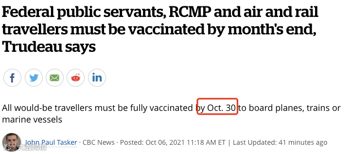 加拿大总理特鲁多于10月6日公布联邦强制疫苗政策,在10月30日前,所有潜在旅客也必须之前全面接种疫苗,然后才能登上飞机、火车或轮船;同时要求联邦公务员月底前必需接种疫苗,否则勒令休无薪假。