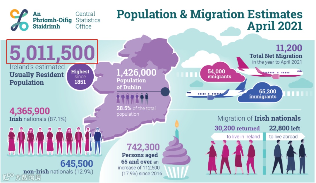 8月31日,爱尔兰中央统计局(CSO)公布的《2021年4月人口及移民估算》数据显示:在自然人口增长和移民持续涌入的综合作用下,爱尔兰总人口从一年前的497万人增加到了501万人,这是自1851年以来,爱尔兰人口首次突破500万。