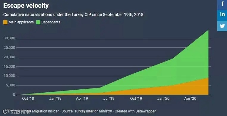 据IMI数据,对2020年10大投资移民项目进行排名显示,依据各项目主申请人的获批数量,土耳其身份获批量约为13325位投资人,与前一年相比增加325%!
