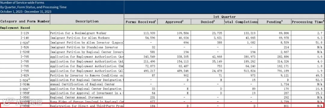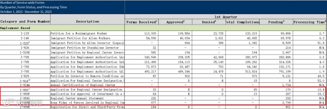 ● I-956(区域中心授权申请表):移民局一共收到了33件申请,批准了89件,还有170件等待审批,平均审理周期10.4个月;