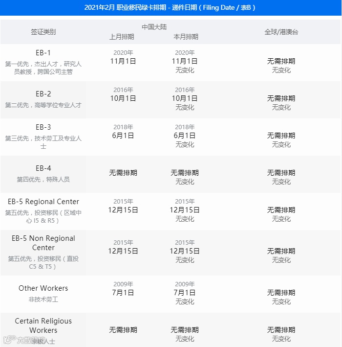 2021年2月最新绿卡排期已发布!官方显示:各类职业移民批准排期继续稳步前进,其中EB-1延续了上个月的趋势,再次大幅前进122天,表A大幅前进122天,EB-3、EB-3表A均有小幅前进,而EB-5止步不前。各类亲属移民则继续缓慢前进。下面来看下具体的签证排期表。