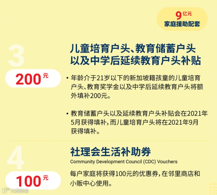 填补儿童培育户头(CDA)、教育储蓄户头(Edusave)和中学后延续教育户头(PSEA):200元