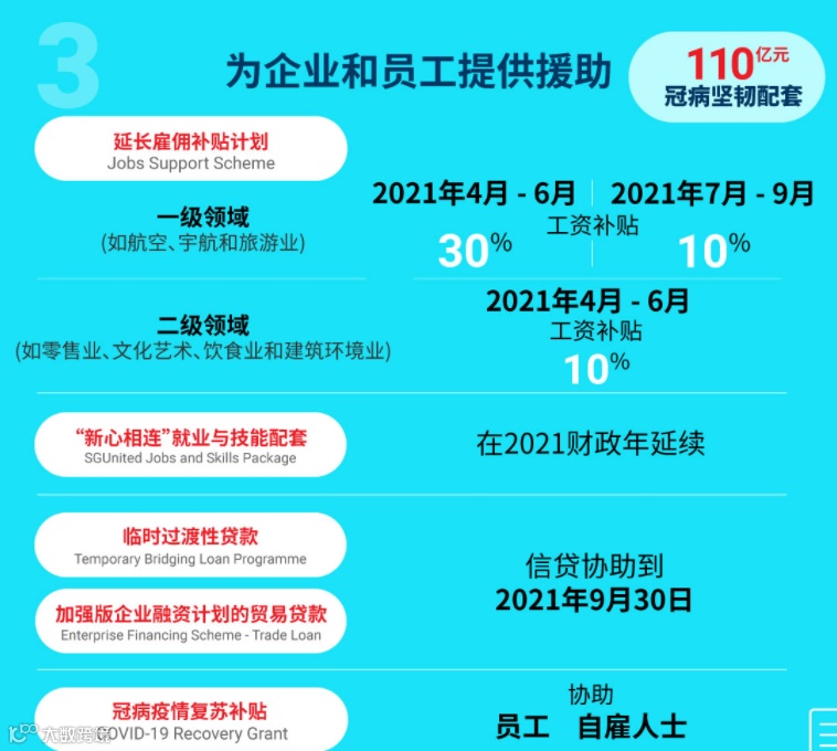 航空业、航天业、旅游业:今年4月至6月获得30%薪金援助,今年7月至9月则获得10%薪金援助;零售、艺术与文化、饮食业、建筑业:今年4月至6月获得10%薪金援助。
