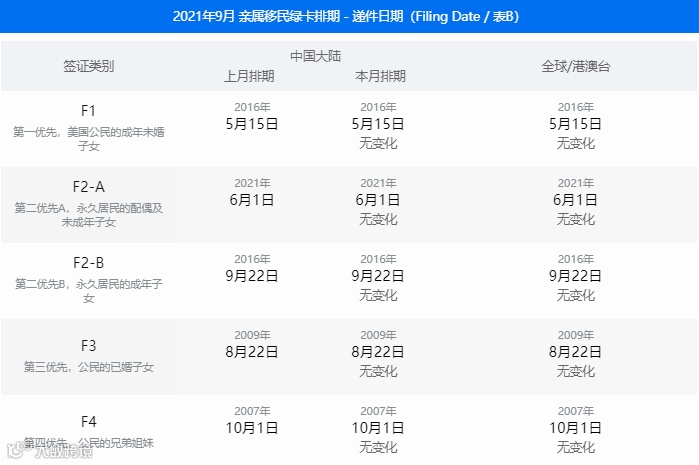 在2021年9月的签证公告中,亲属移民除了F2A类别继续无排期,F2B无变化,其他类别均缓慢前进。