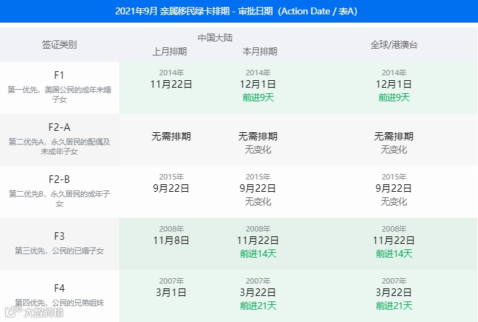 F1(公民的21岁以上未婚成年子女):2021年8月排期为2014年11月22日,2021年9月排期前进8天,为2014年12月1日。
