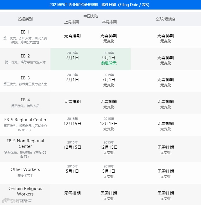 EB-2类别2021年8月排期为2018年7月1日,2021年9月排期前进62天,为2018年9月1日。