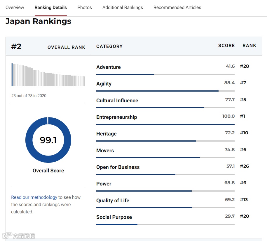 同时,在此次US. News全球最佳国家排名参考指标中,日本的创业精神是10项指标中得分最高的一项,获得了100分,在所有国家中位列第一!灵活性获得了88.4的高分,单项排名位于第七;文化影响力获得了77.7分,单项排名第五。