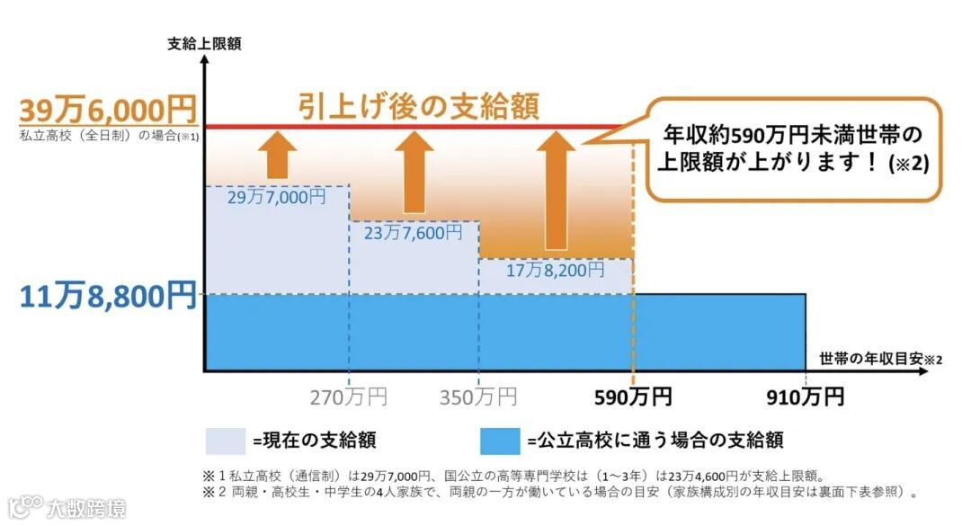 据东京都政府称,都立学校的高中学费每年约为12万日元,私立学校的高中学费约为48万日元。目前,东京都政府为年收入低于 910 万日元的家庭提供最高金额的学费补贴。