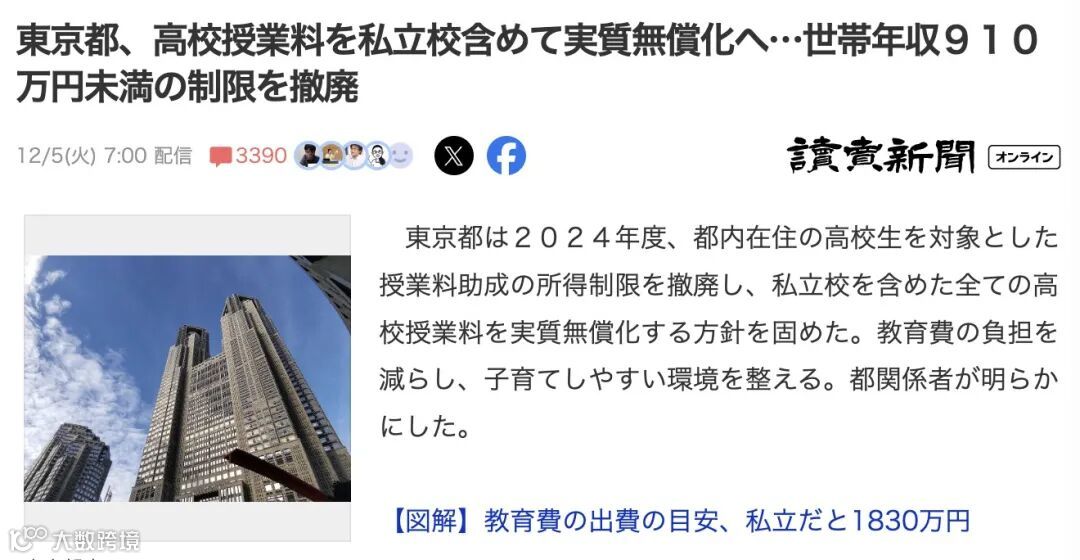 也有专家表示:作为教育费用政策专家,我坦诚评价东京都知事小池百合子的明智决定,即高中完全免费,包括私立高中没有任何收入限制。