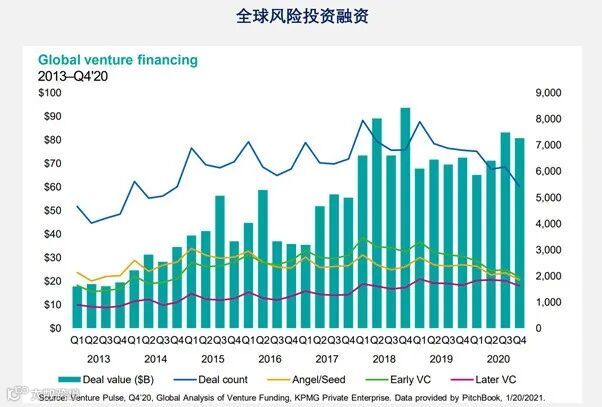 风险投资 (Venture Capital) 又称创业投资,是股权投资的一种,主要是指向初创企业提供资金支持并取得该公司股份的一种融资方式,两者的最终目的是通过分利润或股利获利,下图反映出2013至2020年全球风险投资融资的金额及走势。